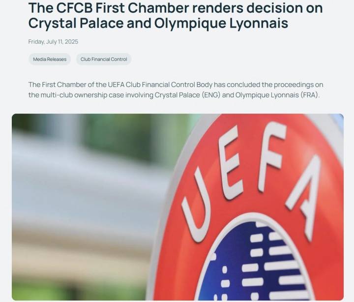 北京时间7月12日消息,昨晚,欧足联官方宣布,水晶宫和里昂因违反欧足联俱乐部比赛条例第5条规定的多俱乐部所有权规则遭到处罚。其中,水晶宫被剥夺欧联杯资格,降级参加欧协联,而里昂将参加欧联杯。据悉,诺丁汉森林将递补参加下赛季欧联杯。